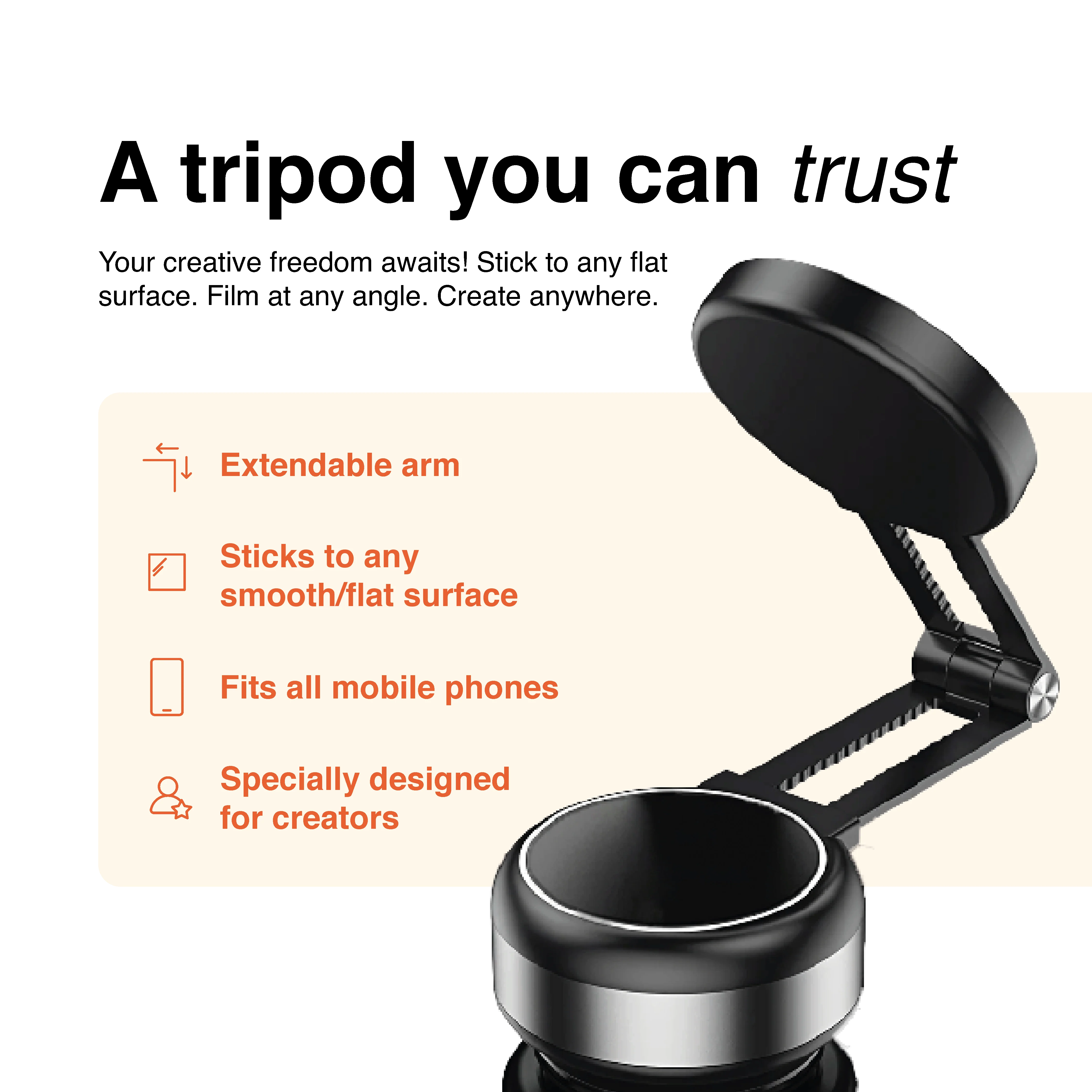Create from any angle. This ultra-strong suction tripod sticks to mirrors, windows, or gym walls for hands-free content. Built for hairstylists, fitness coaches, and vloggers on the move.
